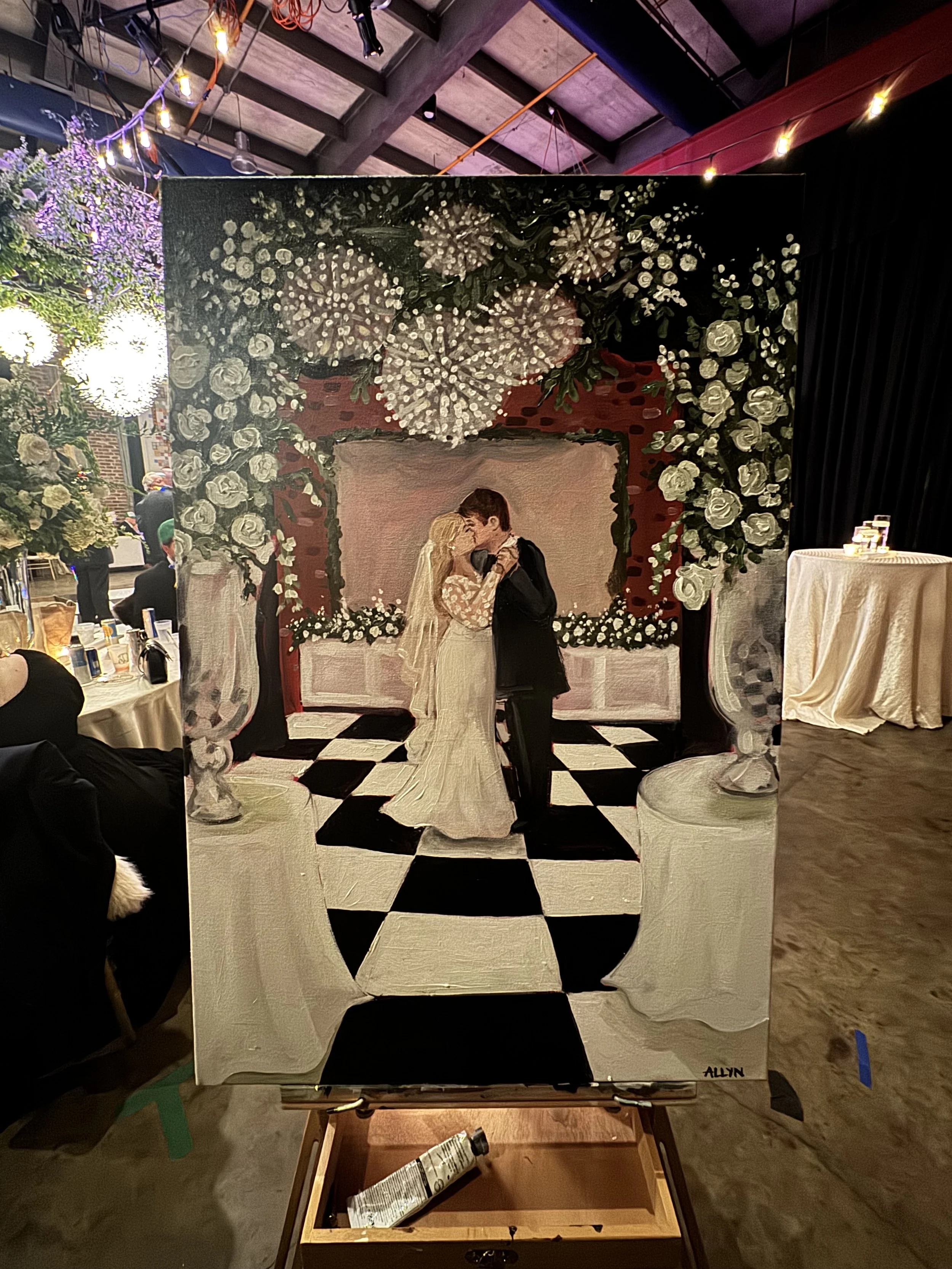 First things first - go ahead and fill out the inquiry on this page. We will nail down the perfect size painting for you and discuss anything additional you may want. Once our contract is signed and your deposit is received, I can confirm with you that your date is booked! In addition to reserving your date on my calendar, I book travel, book a hotel if needed, coordinate with your venue or wedding planner, order your canvas, and more. Due to these requirements, 50% of your total payment is required to book your event and refunds cannot be issued if you cancel. That’s a lot of mumbo jumbo to say I CAN’T WAIT TO PAINT FOR YOU!